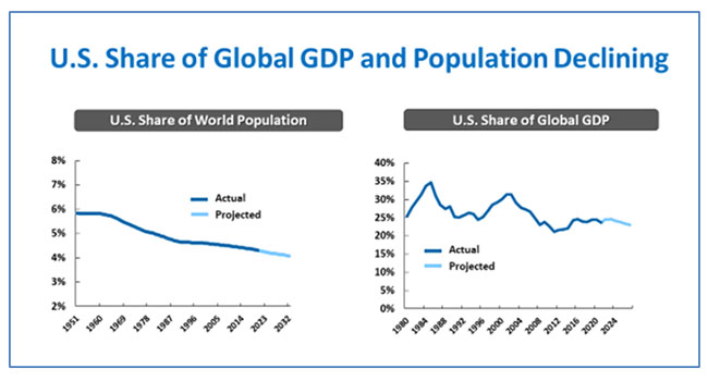 Despite the fact that the U.S. share of global economy activity and total population continues to decline:
